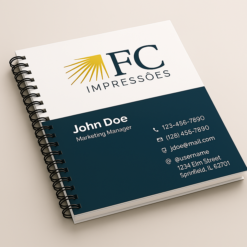 Ideal para cursos, treinamentos ou materiais institucionais. Com design profissional, capa resistente e aplicação da sua logo, garantimos apresentação de alto padrão e praticidade no uso.